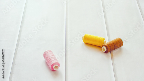 © serg6legion, Naklejka premium Three reels of threads lie on a table of light wood.