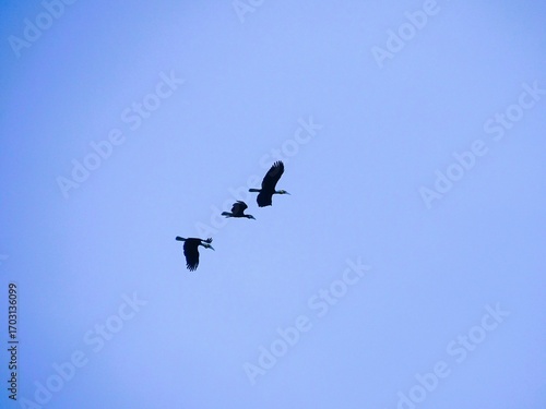 © Suriansyah, Obraz premium Three Rhyticeros undulatus birds flying above the blue sky.
