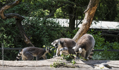 © annettbro, Naklejka premium three ring-tailed lemur, lemur catta, eating green leaves, sunny day