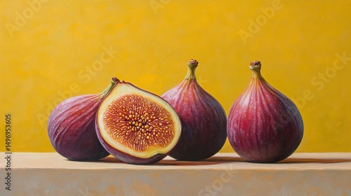 Obraz premium Three Ripe Figs, One Sliced Open to Reveal the Seeds, on Yellow Background, Still Life