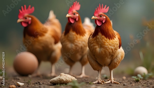 © siti, Fototapeta premium Three Roosters and a Hen in a Rural Setting
