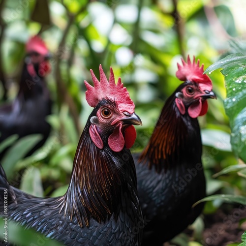 © Mokha, Fototapeta premium Three roosters in a lush garden setting. Close-up of their heads and upper bodies. Dark plumage, reddish combs. Blurred background of foliage