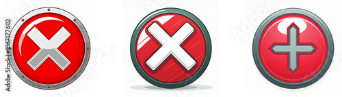 Fototapeta premium Three round buttons with a metallic rim. The left two buttons are red with a white cross, the third is red with a grey plus sign.