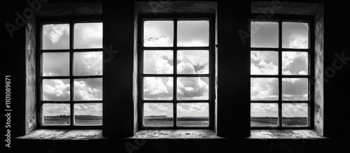 Naklejka premium Three rustic windows framing a dramatic black and white sky with clouds and...