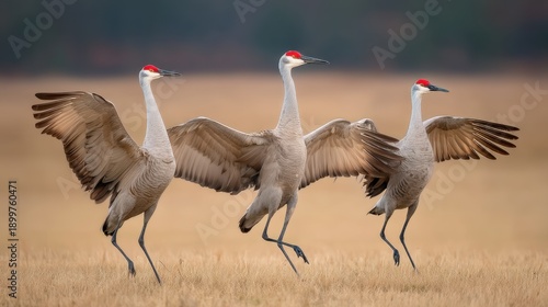 © 69, Obraz premium Three Sandhill Cranes Dancing Gracefully in a Serene Landscape