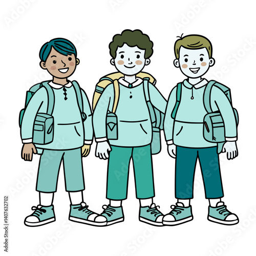 Fototapeta premium Three school boys in casual outfits with backpacks illustration for educational blogs, back-to-school content, stationery design, or awareness campaigns