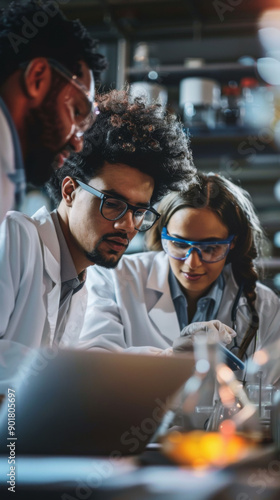 © alfa27, Fototapeta premium Three scientists are working together on a laptop computer