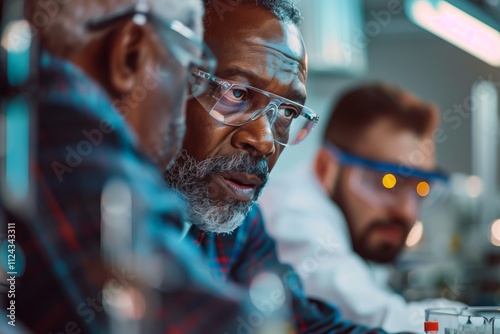 © S photographer, Obraz premium Three scientists engaged in serious laboratory discussion and research.