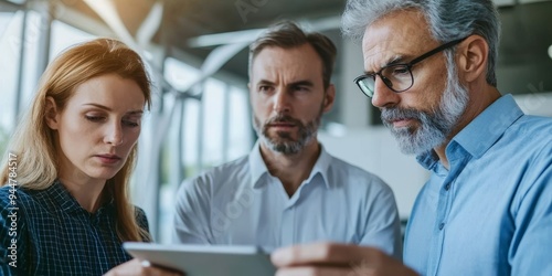 © kwanchaift, Obraz premium Three scientists in a close-up shot analyzing data from a wind farm on a tablet their serious expressions showing deep concentration on renewable energy