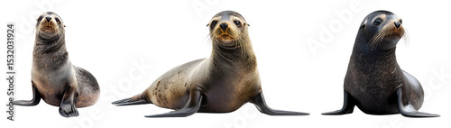 © pnggalaxy, Naklejka premium Three sea lions are positioned side by side in a row each facing forward with slightly different poses on black