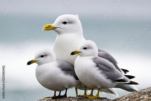 © haiqiang, Obraz premium three seagulls are standing on a rock near the ocean