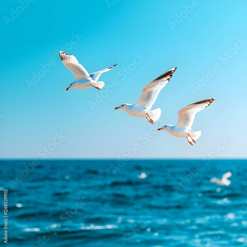 © Arthur Constantine, Fototapeta premium Three Seagulls Flying Over Blue Ocean Under Bright Sky