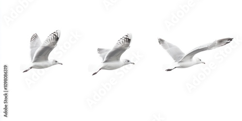 © raja, Obraz premium Three seagulls in flight against a white background.