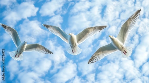 Fototapeta premium Three Seagulls Soaring in Blue Sky.