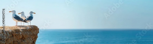 © thanawat, Obraz premium Three seagulls standing on a cliff edge overlooking the vast blue ocean under a clear sky, with ample space for text on the right.