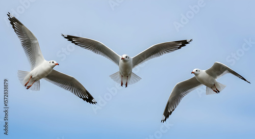 Fototapeta premium Three seagulls with white and gray plumage soaring in a clear blue sky with wings fully extended in flight
