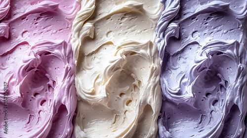 Obraz premium Three segments of pastel whipped textures in lavender, ivory, and cream, each distinguished by delicate swirls, creating an elegant and artistic visual flow.