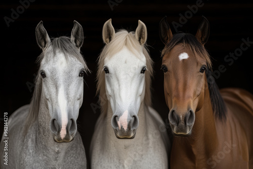 © volga, Obraz premium Three serene horses standing side side in stable