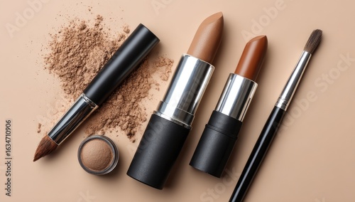 © Hamid, Obraz premium Three shades of brown lipstick, a makeup brush, and loose powder on a beige background