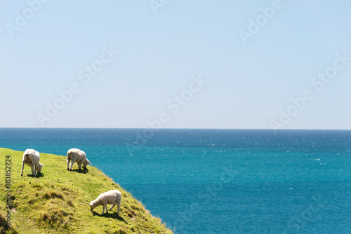 © ventura, Obraz premium Three sheep grazing on grass of Mount Maunganui, New Zealand