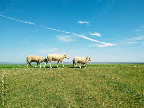 Fototapeta premium Three sheep on a dyke in northern Germany
