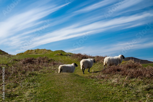 Fototapeta premium Three sheep on a hillside in the fairy glen on the isle of Skye