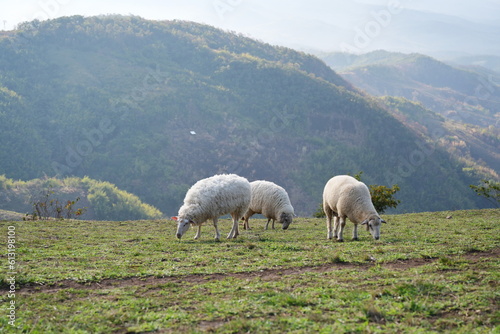 © Vanchuree, Fototapeta premium Three sheep stand grazing on the farm. Fluffy Corriedales sheep stand foraging on a sunny morning.
