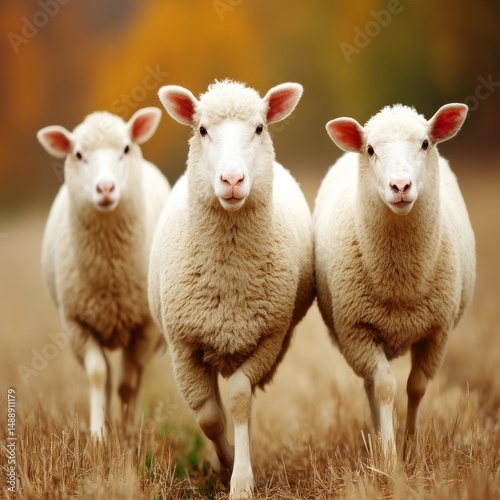© rfassets, Fototapeta premium Three Sheep Walking Toward Camera in Autumnal Field, Agricultural Scene