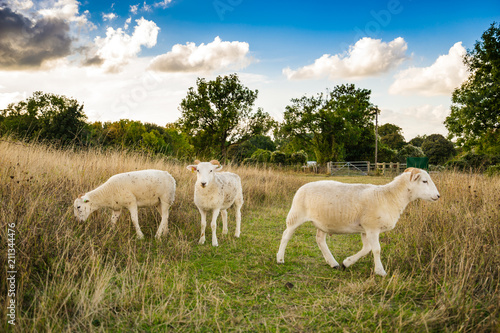 Fototapeta premium Three sheeps on the meadow - selective focus