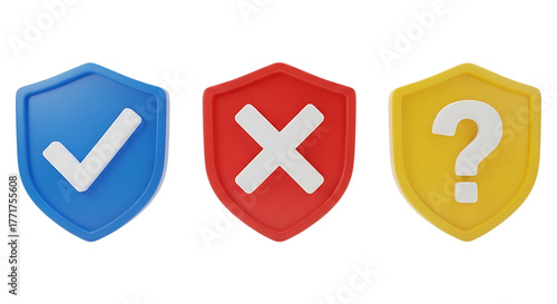 Obraz premium Three shield icons representing yes no and question isolated on transparent background