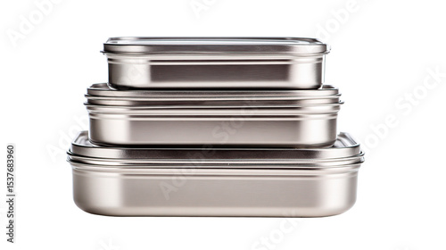 © Ingrid, Obraz premium Three shiny rectangular metal containers stacked on top of each other in a vertical arrangement view on transparent background