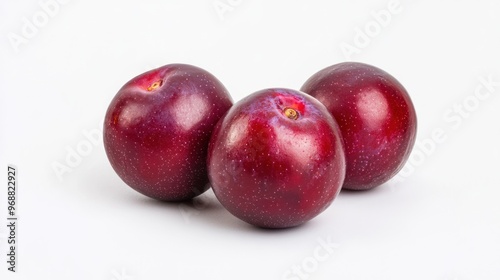 © BerkahStock, Obraz premium Three shiny red plums arranged on a white background.