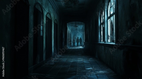 Obraz premium Three Silhouettes Walking Down a Dark, Eerie Hallway