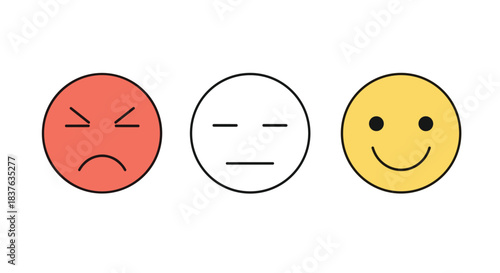 Fototapeta premium Three simple emoticons for feedback, showing angry, neutral, and happy faces with minimalist outlines and basic colors.