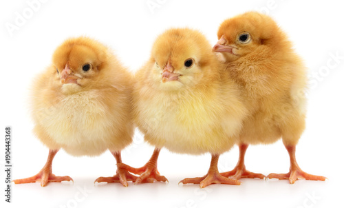 Fototapeta premium Three small yellow chickens standing on white background looking at camera
