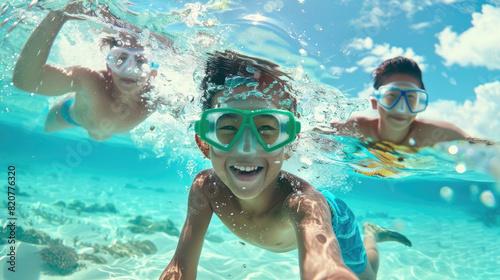 Fototapeta premium Three smiling children are snorkeling in clear blue tropical waters, exploring underwater marine life on a sunny day. They wear colorful snorkel masks and swim towards the camera with excitement