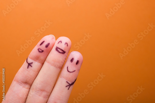 © projectio, Fototapeta premium three smiling fingers that are very happy to be friends