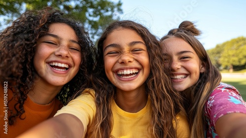 © iuricazac, Obraz premium "Three smiling girls taking a selfie outdoors."