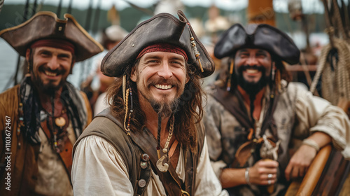 © RISHAD, Fototapeta premium Three smiling male pirates on ship deck wearing tricorn hats