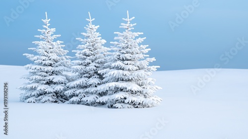 Naklejka premium Three snow-covered evergreen trees stand in a snowy field against a clear...