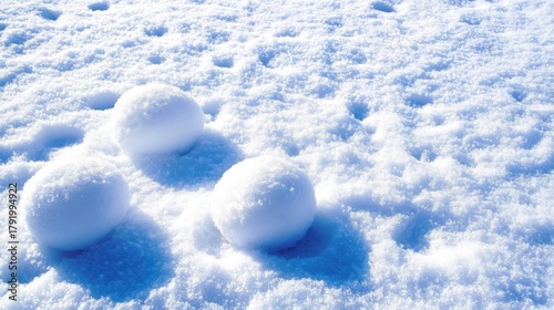 © Alfiyah, Fototapeta premium Three snowballs on sparkling white snow, casting shadows under bright winter sun