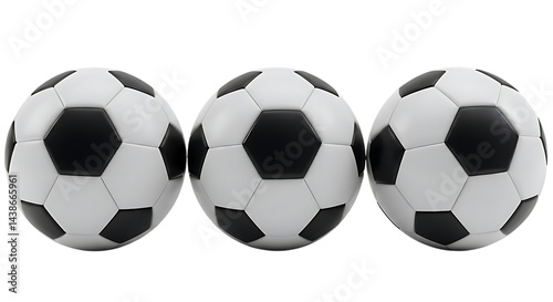 © TAIFUR, Obraz premium Three soccer balls arranged in a row with a black background and white and black pattern visible clearly on transparent background