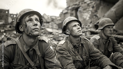 © Adobe Contributor, Fototapeta premium Three soldiers looking up at the sky during the war