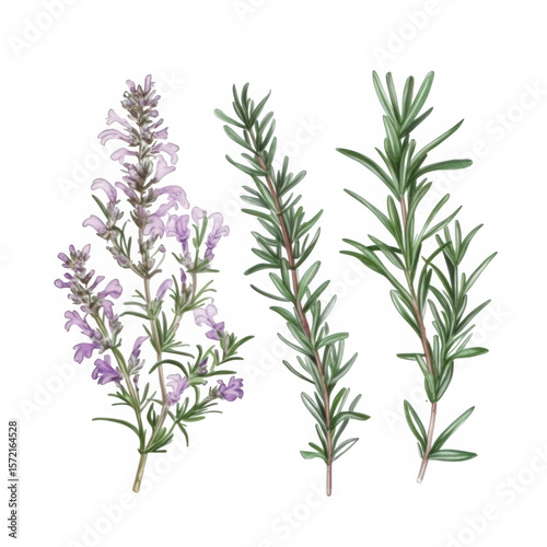 © ArtOm@r98, Obraz premium Three sprigs of fresh rosemary and lavender herb isolated on transparent background