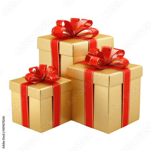 Obraz premium Three stacked golden gift boxes with red ribbons