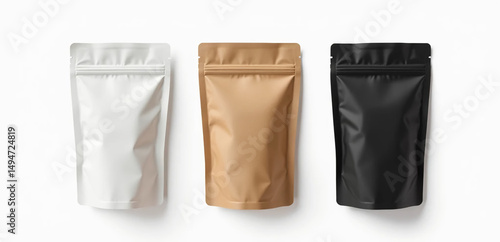 Obraz premium Three standing pouch on white studio background, with soft natural lighting. Perfect for eco-friendly packaging and product mockup.