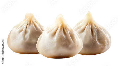 Obraz premium Three Steamed Soup Dumplings: A trio of succulent soup dumplings, glistening with savory broth and ready to tantalize your taste buds. Each dumpling is a delicate work of art.