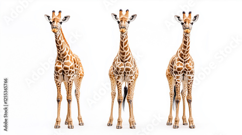 © Tobias, Obraz premium Three striking giraffes stand tall with their iconic patterned coats against a white background. Elegance in a minimalist scene.