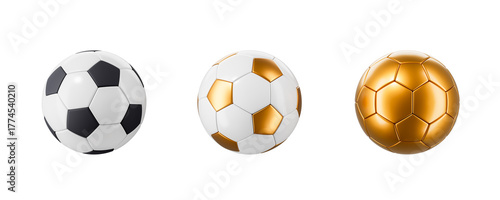 Naklejka premium Three stylish soccer balls including classic, gold-accented, and full-golden...