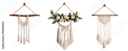 Naklejka premium Three stylish wall hangings featuring macramé designs with natural accents,...